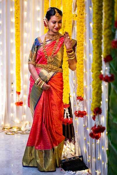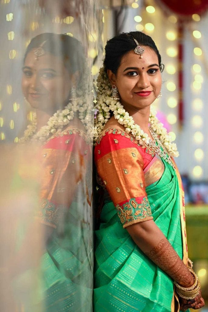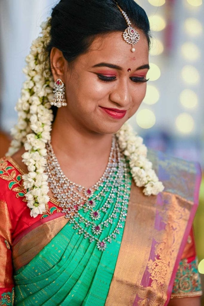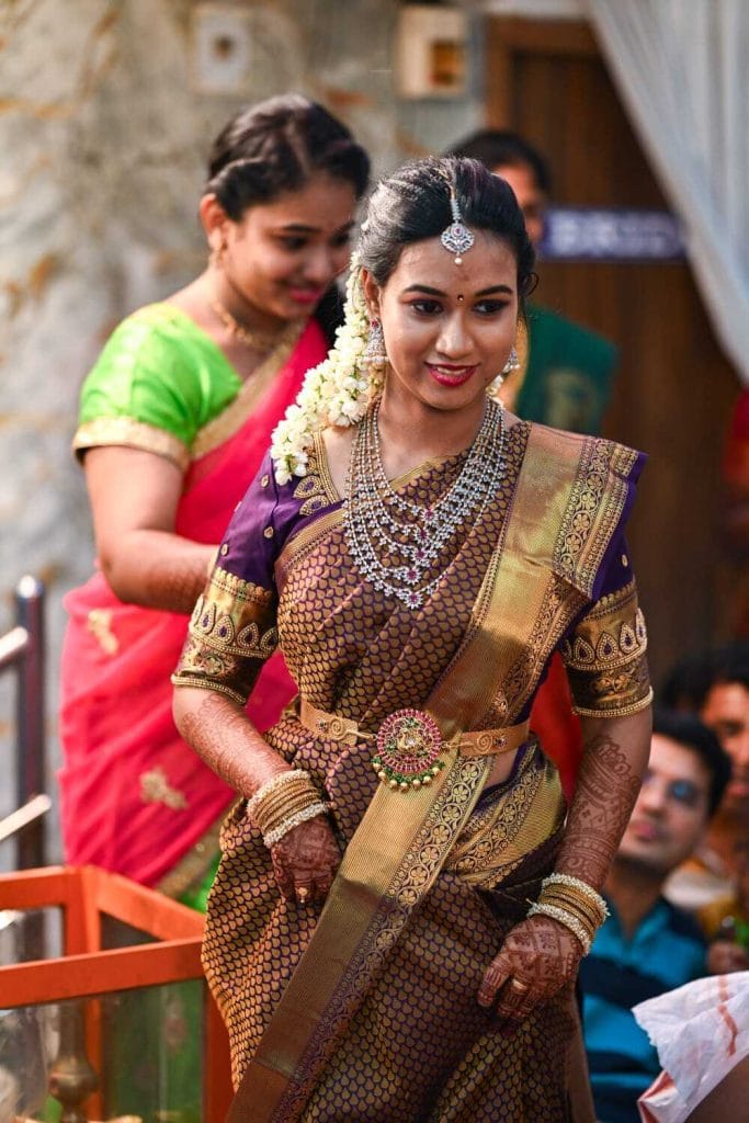 The powerful weaves of our Indian culture were well woven in bright colours and with traditional motifs. Notably each of my blouses and bangles were crafted intricately with exquisite designs. On the sets of Muhurtham, the major part of wedding was my most favourite and appealing drape ever. I wore the authentic Madisar in bold maroon and green shade with delicate vairaoosi stripes all over the madisar. Embedded in divinity were the serene pieces of Goddess Lakshmi in my blouse and jewelry sets. What could be more complimenting and wholesome than this for a wedding?