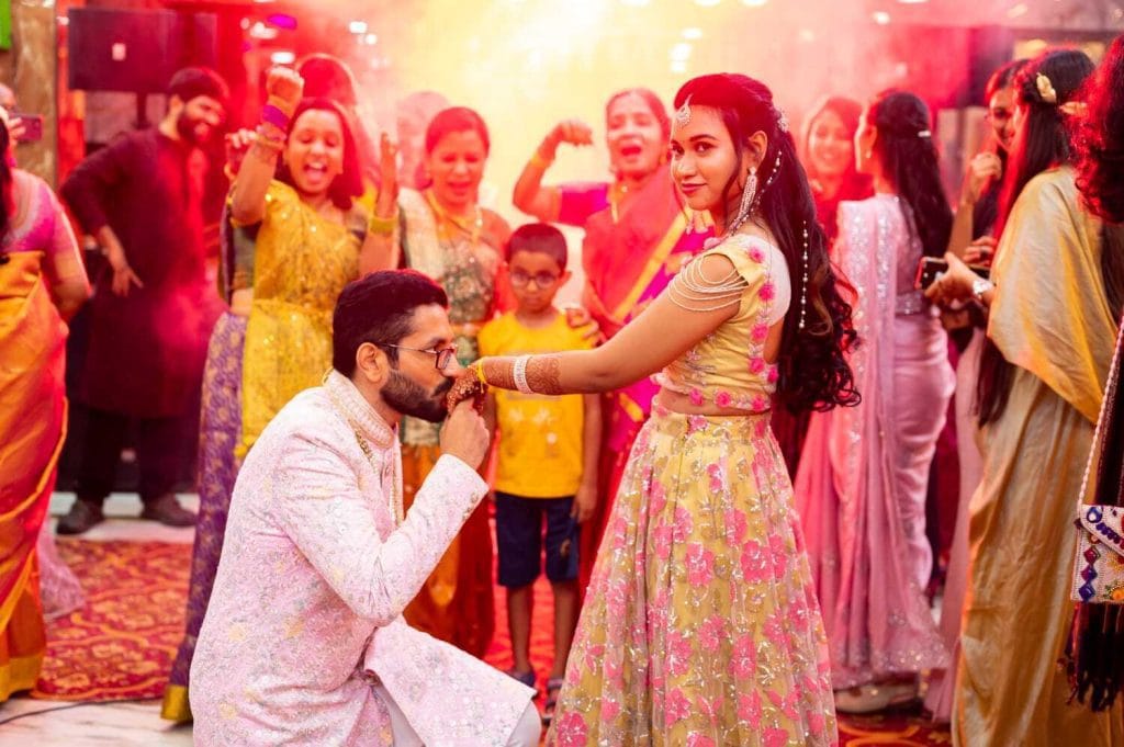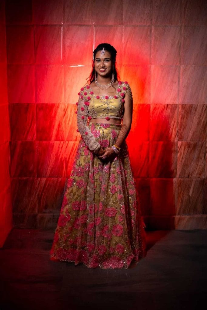 Here’s to the Gala part of the wedding, The Reception! Floored by DJ,  the huge mass was full of zest dancing to the lively beats! Fashion’s all time go to list and the year 2023’s trend made me recollect about floral lehengas. My memorable attire on this day was custom made. I wore a pink hued lehenga with square neck blouse designed in asymmetry, having one hand full arm net and the other in sleevless with layers of string hung to the sleeve elegantly. The skirt had a shimmering pastel green satin layer with a netted overlay. Scattered were the flowers crafted all over my skirt and blouse in pink blossoms. The attire was finally coupled with pink studded jewelry pieces. Complimenting to my attire, my duo wore a light pink sherwani crafted with finest design and tinch of green mildly scattered all over the body. However, this auspicious occasion where laughter and goodness materialized well, keeps persisting with it’s rejoicing reminiscence forever.